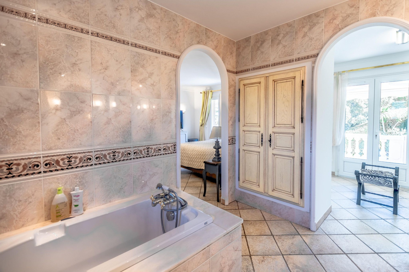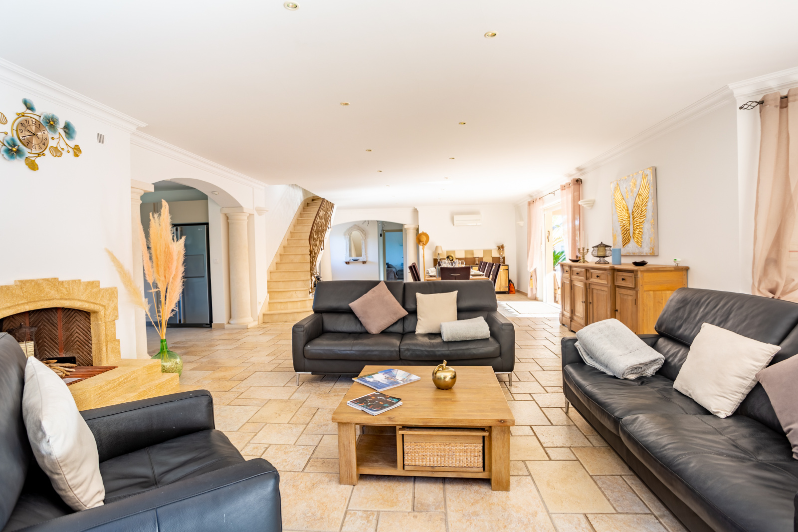 Dotée d'un vaste séjour salle à manger cheminée et d'une cuisine indépendante équipée, elle comprend aussi en rez de piscine 2 chambres avec leur salle d'eau,toilettes, à l'étage une suite parentale avec salle de bains et salle de douche ,magnifique dressing, toilettes, ainsi qu'un très beau solarium avec aperçu mer. en rez de jardin ,deux autres chambres avec salle de bain et salle de douche, toilettes, salon jeux , cave;