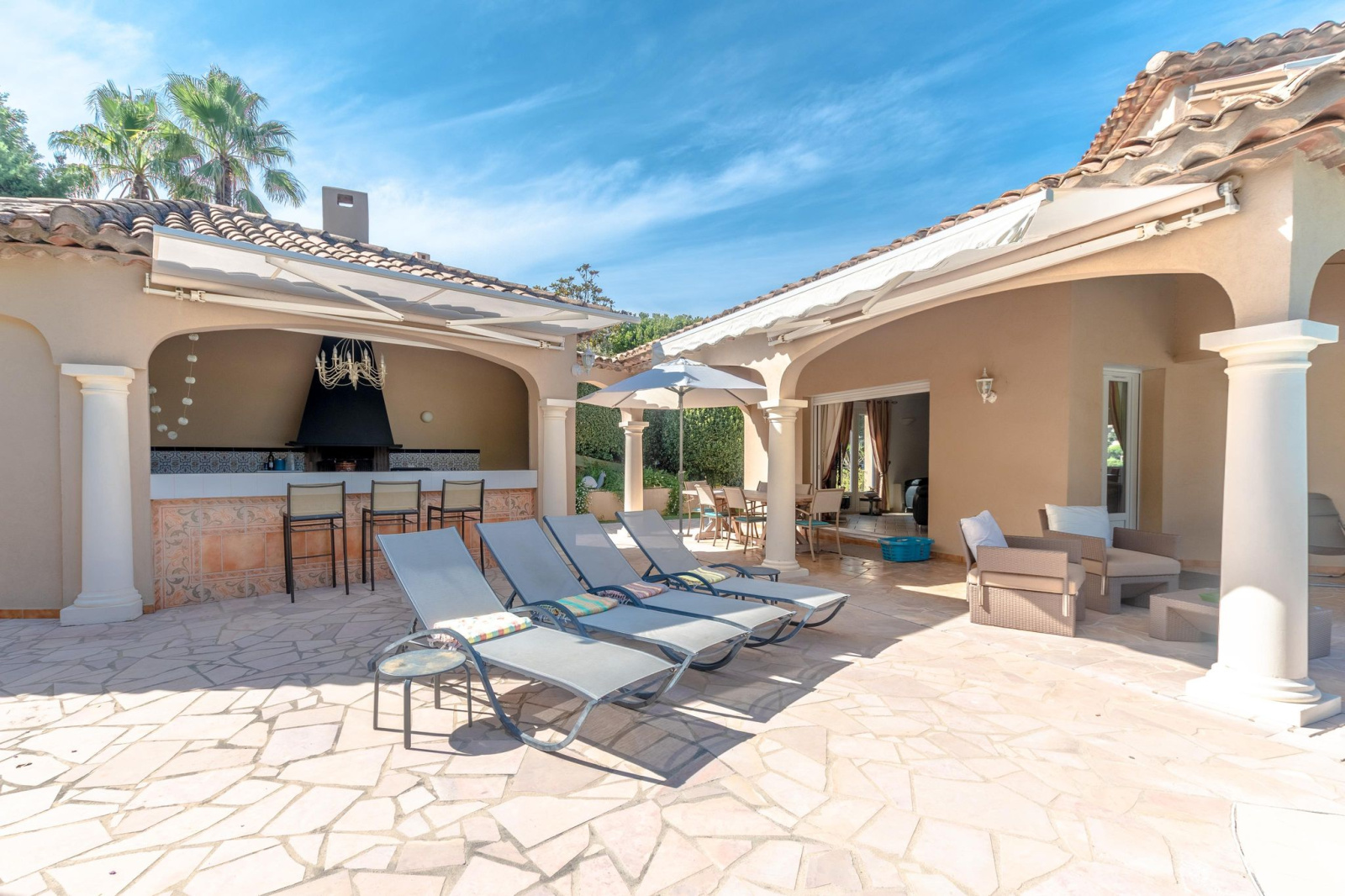 Sainte-Maxime (83120)À 15 minutes de Saint-Tropez , dans la baie des anges , A Sainte-Maxime, dans un domaine sécurisé , résidentiel et recherché , Villa située à 400 mètres des plages et des restaurants de la Garonnette, cette magnifique demeure de 300 m2 peut recevoir 10/12 personnes, Cette villa familliale vous seduira par son charme ses attraits ,ses materiaux nobles et son confort .