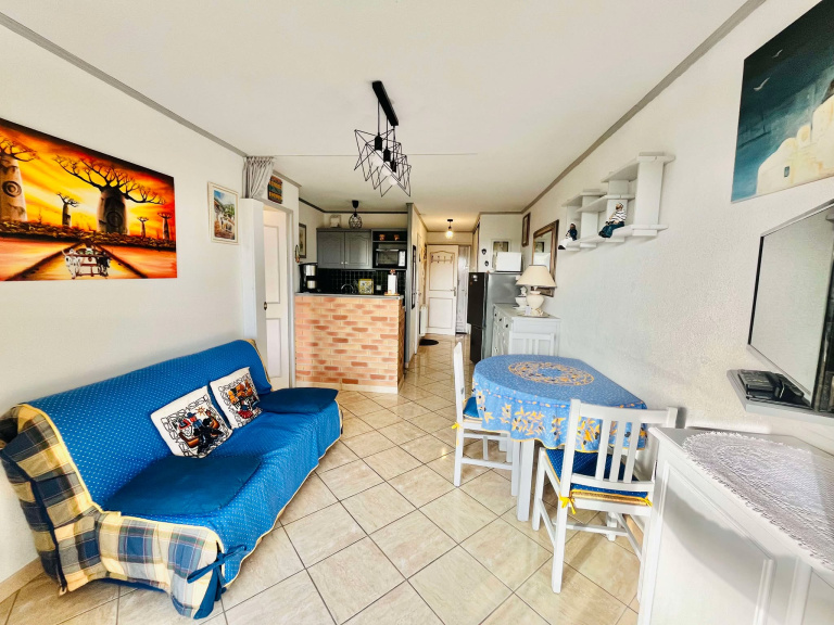 T2 d’environ 35m2 composé d’une pièce salon ouvert sur la terrasse, cuisine équipée : L.L, four, micro-onde, plaque trois feux induction, une salle d’eau, un WC séparé, une chambre ouverte sur la terrasse. Pas de climatisation, un garage, piscine dans la résidence. Gardien à l’année. A 5 minutes en voiture des plages du centre-ville et des premiers commerces.
